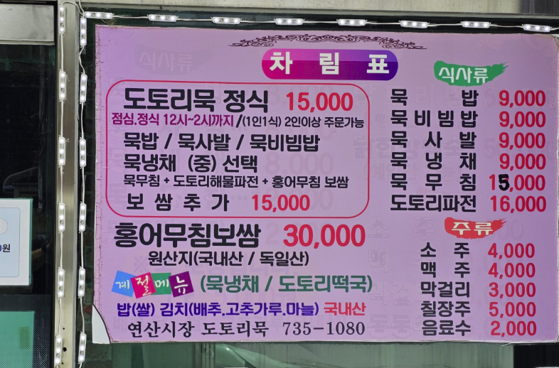 그중에서도 연산시장 맞은편에 자리 잡은 연산시장 도토리묵집은 현지인들이 줄 서서 먹는 곳이자, 방송에도 여러 차례 나온 유명 맛집입니다.
