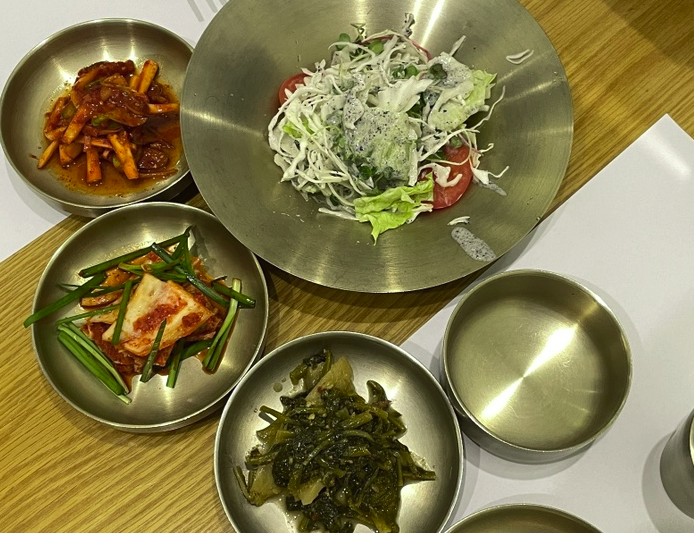 기본 반찬만 해도 11가지. 샐러드, 잡채, 튀김, 나물, 김치, 고추지 등 계절에 맞춘 재료들이 정갈하게 담겨 나옵니다.