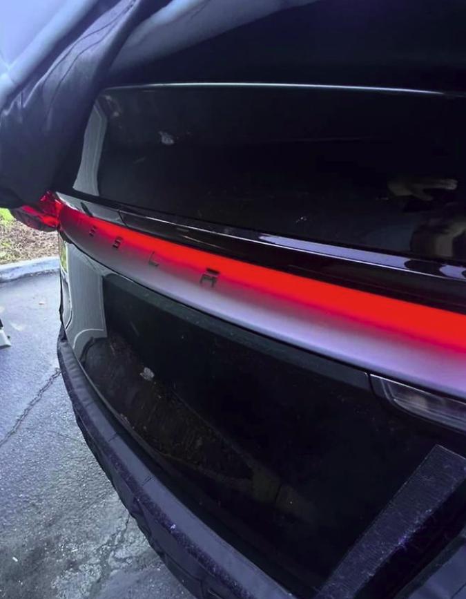 첫 번째 유출 사진에서 가장 눈에 띄는 부분은 후면에 조명이 켜진 테슬라 브랜드 배지입니다.